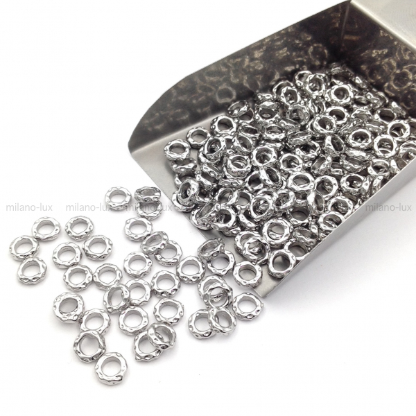 Бусина спейсер из латуни с покрытием Платина, форма мятого круга. Размер 5,3*5,5мм, толщина 1,7мм, внутренний диаметр 3,2мм