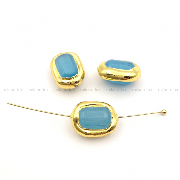 Бусина из Кошачьего глаза (стекло) в обрамлении латуни с покрытием Золото 18К. Размер примерно 15*11мм (+-0,5мм), толщина примерно 7-8мм. Отверстие 1мм. Каждая бусина индивидуальна.
