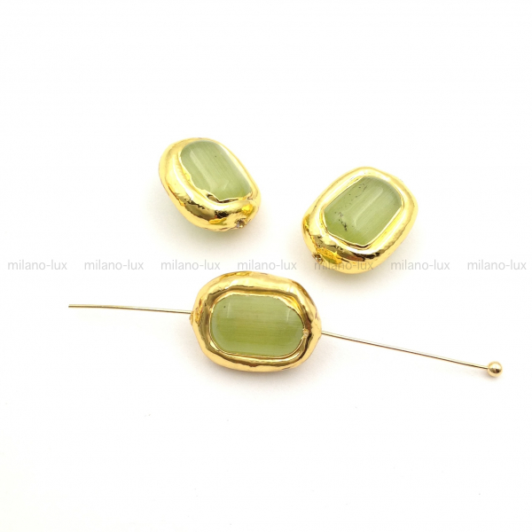 Бусина из Кошачьего глаза (стекло) в обрамлении латуни с покрытием Золото 18К. Размер примерно 15*11мм (+-0,5мм), толщина примерно 7-8мм. Отверстие 1мм. Каждая бусина индивидуальна.