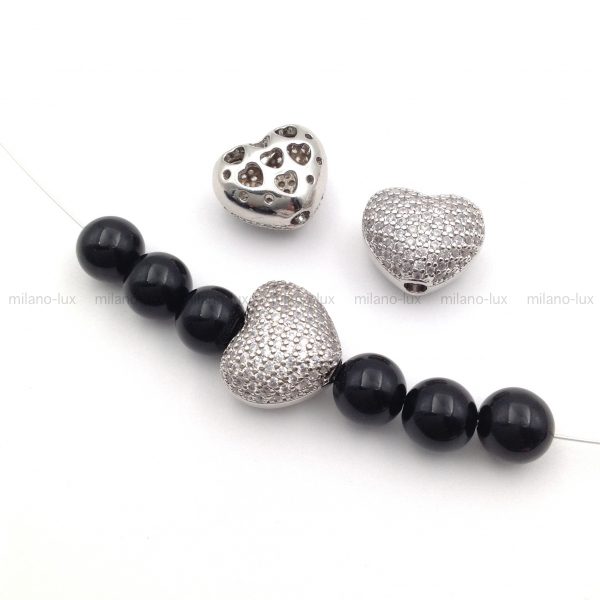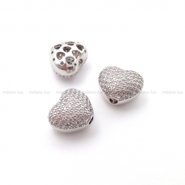 Бусина в форме сердца, объёмная, изготовлена из латуни с покрытием Платина. Размер 15,2*12,6мм, толщина 9,6мм, отверстие 2,5мм. Инкрустация фианитами с 1й стороны