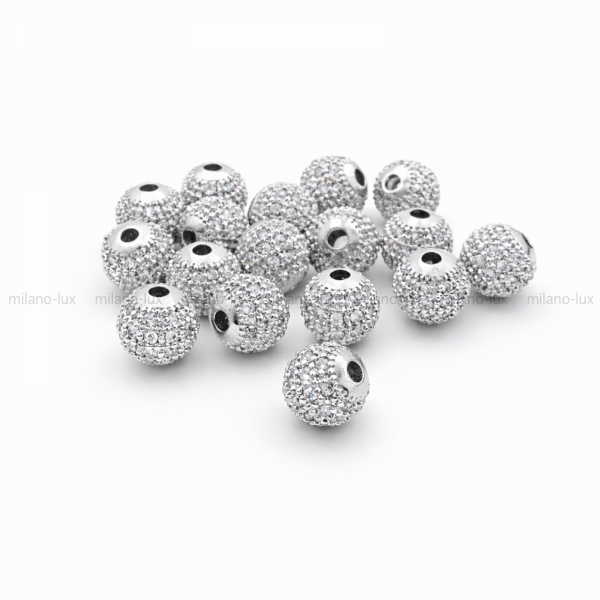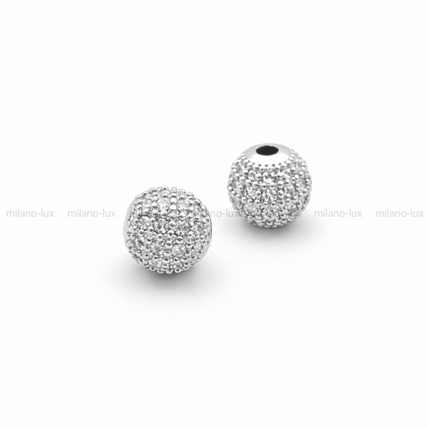 Бусина для украшений в форме шар, Размер 8мм, отверстие 1,5мм. Фурнитура премиального качества, изготовлена из латуни с покрытием платина, инкрустировано микро фианитами. Лучшая фурнитура ювелирного качества для создания бижутерии своими руками, актуальные модели по выгодной цене.