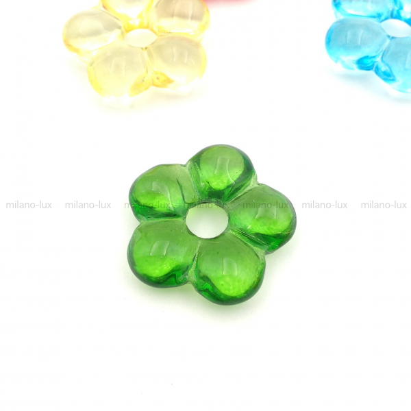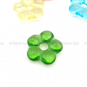 Элемент из стекла в форме цветка, размер 24мм, центральное отверстие 5мм, сквозного отверстия нет, толщина элемента 7мм.
