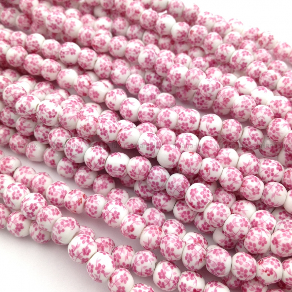 Керамическая бусина Шар 6мм, Розовые цветы; нить 31см