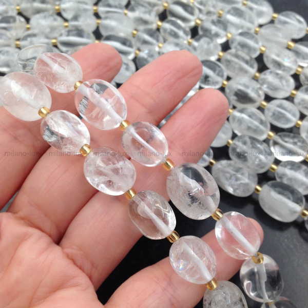 Бусины натурального Горного Хрусталя, размер бусин 13-18мм, форма свободная бочонок. Отверстие 1мм. В бусинах присутствуют каверны, включения и неровности, что не является браком натурального камня.