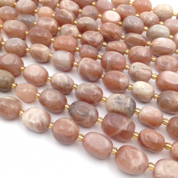 Бусины натурального Санстоуна (полевого шпата) высокого качества, форма бочонок свободная, размер 11-16мм (+-0,5мм), отверстие 1мм. Мелкие каверны, неровности и включения - не являются браком натурального камня.