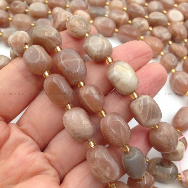 Бусины натурального Санстоуна (полевого шпата) высокого качества, форма бочонок свободная, размер 11-16мм (+-0,5мм), отверстие 1мм. Мелкие каверны, неровности и включения - не являются браком натурального камня.