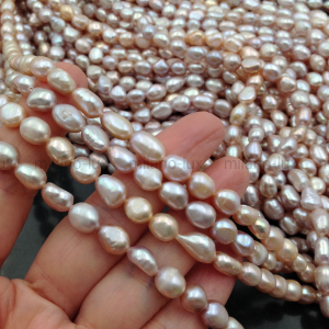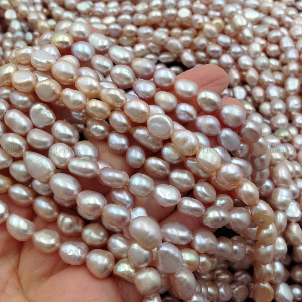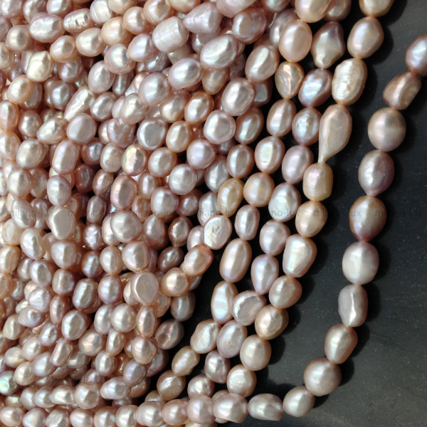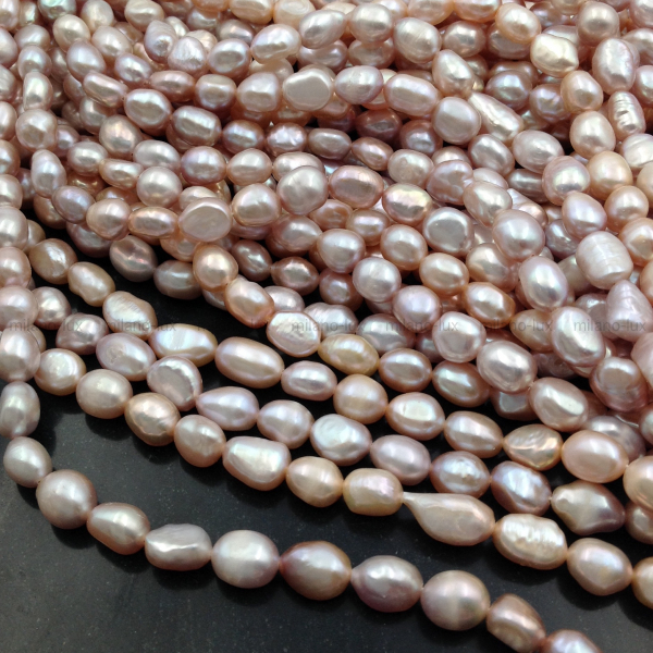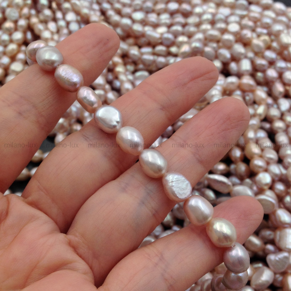 Натуральный пресноводный культивированный жемчуг, отличное соотношения цены и качества, форма барочная рисовидная, размер 6-9мм (+-0,5мм), отверстие 0,6мм. Яркое и плотное сияние, местами есть снижение сияния, бороздки.