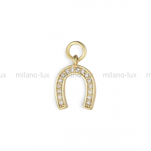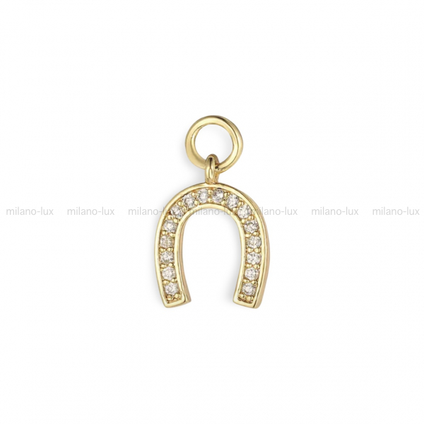 Подвеска в Новогодней тематике года Лошади, форма Подкова, изготовлена из латуни с покрытием Золото 18К, размер 10,6*13,6мм.