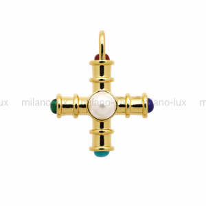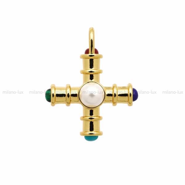 Подвеска крестообразной формы, изготовлена из латуни с покрытием Золото 18К, размер 32,5*26,5мм с учётом петли. Внутренний диаметр петли 4,5мм. Вставки - имитация малахита, бирюзы, лазурита, агата и жемчуга.