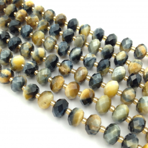 Натуральный тигрово-соколиный глаз, в минерале присутсвуют одновременно участки синевого и золотисто-коричневого тона, форма рондель в ювелирной огранке, размер примерно 10*7мм (+-0,2мм), отверстие 0,9мм