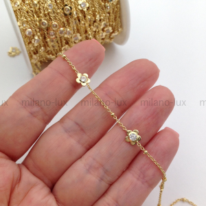 Цепочка из латуни с покрытием Золото 18К, звено 1,1*1,6мм. Вставки Цветок с фианитом - размер 6*6мм, через каждые 2,6см в цепи, и вставка рондель 1мм по центру отрезка между цветами.