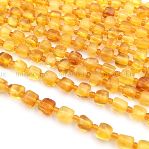 Бусины из натурального янтаря в свобоной кубической форме, в размере 5-7мм, отверстие 0,7мм. Присутствуют включения, неровности поверхности бусин, каверны незначительны.