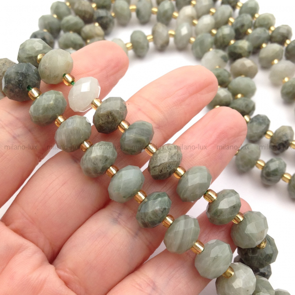 Натуральный зелёный кварц с включениями рутила, высокого качества, форма рондель в ювелирной огранке, размер примерно 10*6,6мм (+-0,2мм), отверстие 0,9мм