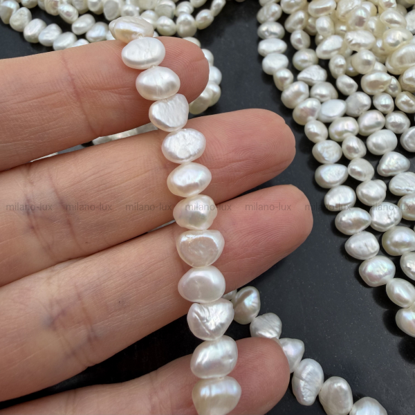 Пресноводный культивированный жемчуг, форма барочная, высокое качество A Grade, бусины уплощены с одной стороны, размер 7*5,5мм (+-1мм), отверстие 0,6мм. Яркое и плотное сияние, нет некрасивых природных несовершенств, минимальное снижение сияния, бороздки и неровности минимальны.