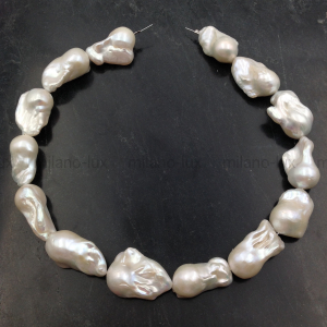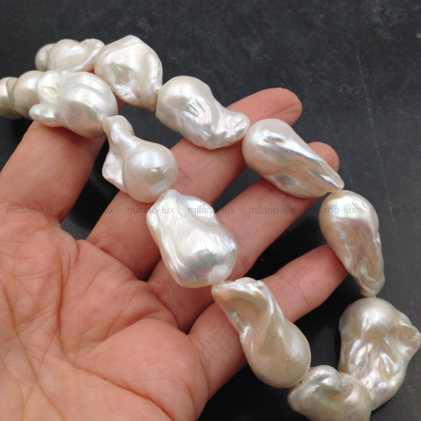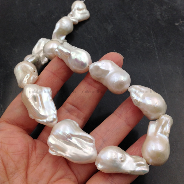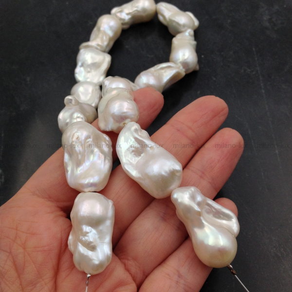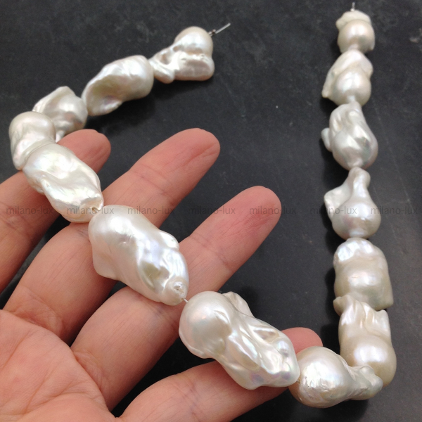 Крупный Барочный жемчуг с ядром AAA Grade/ Натуральный культивированный жемчуг, благородное яркое сияние,- практически нет снижения, на абсолютном минимуме "природные несовершенства". Белый цвет. Очень крупный размер бусин в нити: 24-30мм