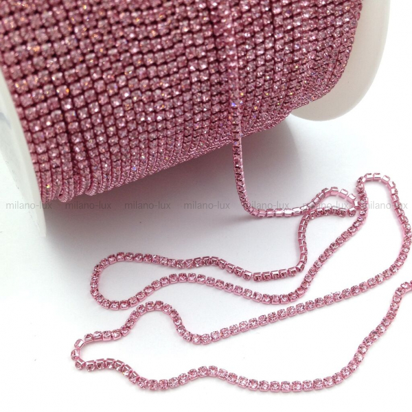 Стразовая цепь 2мм Crystal №110, в розовой оправе, 1 метр