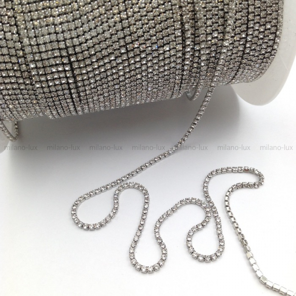 Стразовая цепь высокого качества, вставка- Стекло, металлическая основа жёсткая- латунь, покрытие платина. Размер страза - 2мм, у цепи самое маленькое возможное расстояние между вставками-пробел- менее 0,5мм. Производство - Китай.