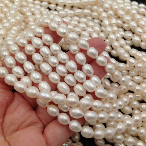 Пресноводный культивированный жемчуг, форма рис. Высокое качество, яркое и равномерное сияние, размер 8,5-10мм (+-0,5мм), отверстие 0,6мм. Присутсвуют слабовыраженные бороздки, минимум природных несовершенств, снижение сияния присутствует мало.